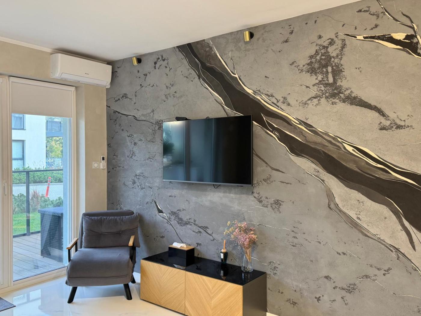Apartament z 1 sypialnią. Guests will have a special experience as the apartment provides a sauna. This air-conditioned apartment consists of 1 living room, 1 separate bedroom and 1 bathroom with a shower. Guests can make meals in the kitchen that is equipped with a stovetop, a refrigerator, a dishwasher and kitchenware. The apartment features tiled floors, a seating area with a flat-screen TV, a washing machine, a tea and coffee maker as well as garden views. The unit offers 2 beds. Apartament - 5 osobowy. Powierzchnia pokoju ok.: 43 mkw.