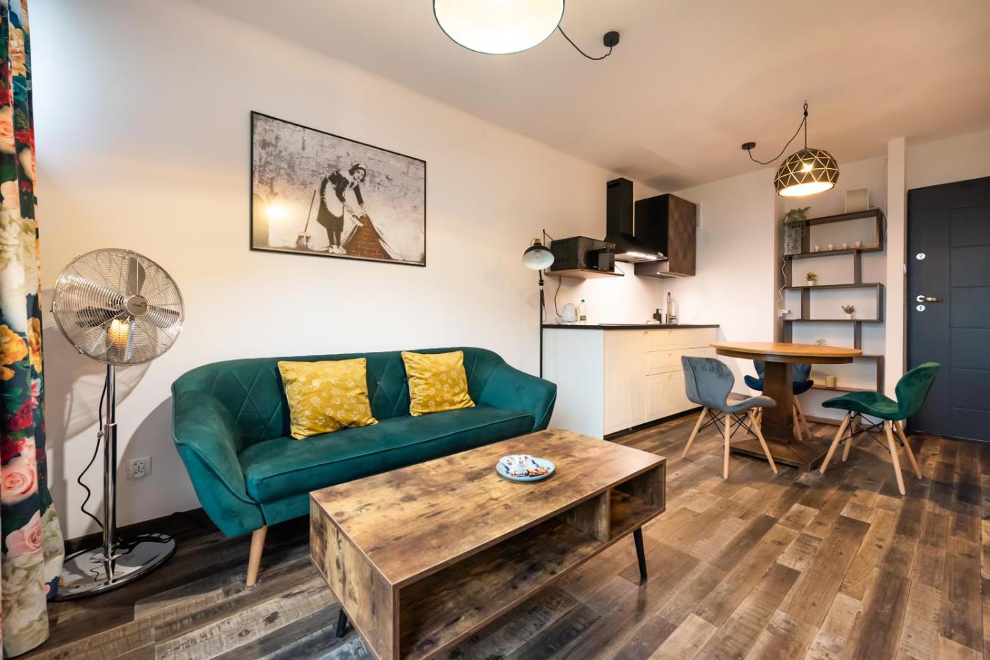 Oferta apartamentu obejmuje sypialnię (1), salon, aneks kuchenny z pełnym wyposażeniem, w tym lodówką i czajnikiem, a także łazienkę (1) z prysznicem oraz bezpłatnym zestawem kosmetyków. W apartamencie zapewniono ręczniki i pościel.