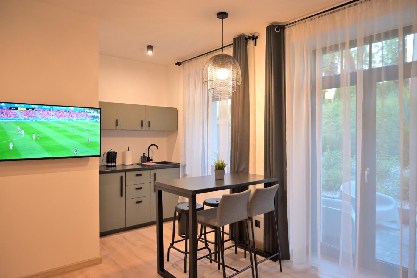 Apartament z 1 sypialnią. This apartment includes 1 living room, 1 separate bedroom and 1 bathroom with a shower and a hairdryer. Meals can be prepared in the kitchenette, which is fitted with a stovetop, a refrigerator, a dishwasher and kitchenware. The apartment offers a tea and coffee maker, a seating area, a dining area, a wardrobe and a flat-screen TV with streaming services. The unit has 2 beds. Apartament - 4 osobowy. Powierzchnia pokoju ok.: 33 mkw. ;